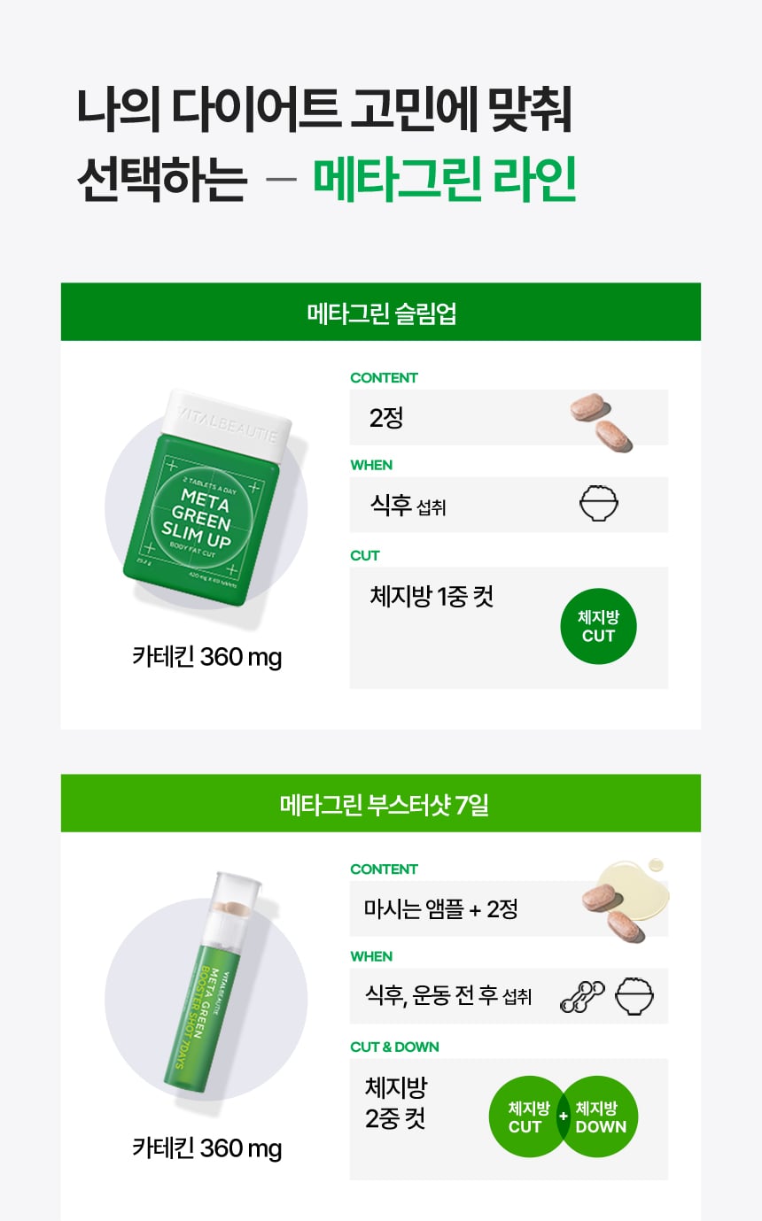 바이탈뷰티의 베스트 셀러 메타그린 라인. 다이어트 고민에 따라 다르게 선택해보세요. *여러가지의 다이어트 건강기능식품을 동시에 병행 섭취하는 것을 주의하세요.