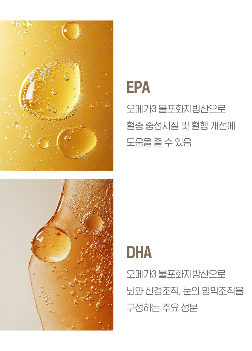 오메가케어는 혈행 개선뿐 아니라 눈 건강과 기억력 개선의 3중 기능성을 인정받은 멀티 건강기능식품입니다. EPA는 혈액 내 중성지방을 낮추고 혈행을 원활히 하며, DHA는 두뇌·망막의 구성성분이자 특히 성장 발달 시기에 필요한 성분으로, 신체의 성장과 유지에 중요한 기능을 합니다.